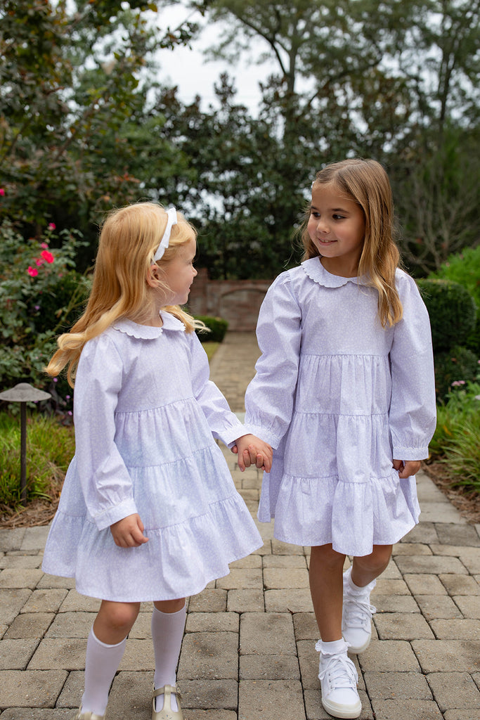 The Polly Dress brings playful charm in a soft lavender hue, perfect for spirited girls. Adorned with floral ric rac trim on the collar and sleeves, it adds a whimsical touch to every move. Lightweight and fun, this dress is ideal for lively days filled with joy and imagination.