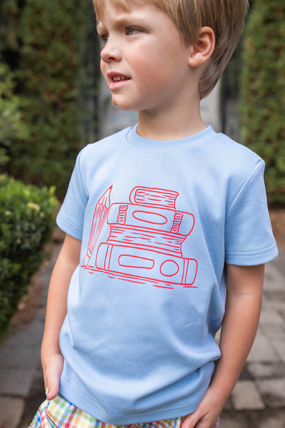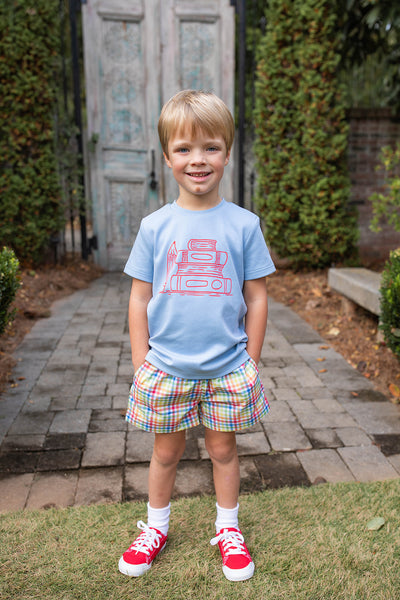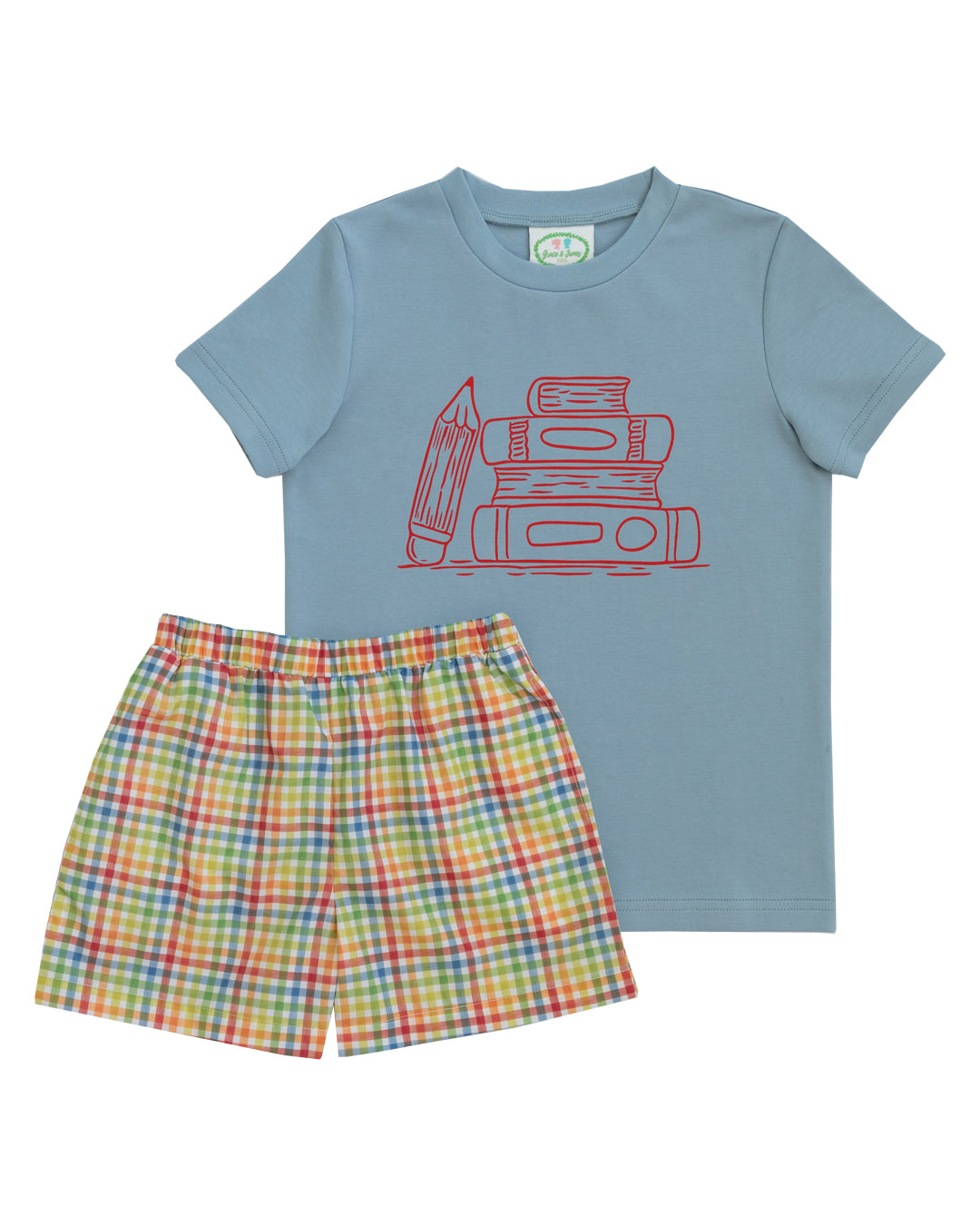 This playful School Book T-Shirt Set combines a classic primary plaid with a comfy tee, perfect for boys heading back to school. The shorts feature handy pockets for storing little treasures, making it both cute and practical. Ideal for casual days filled with fun and learning!