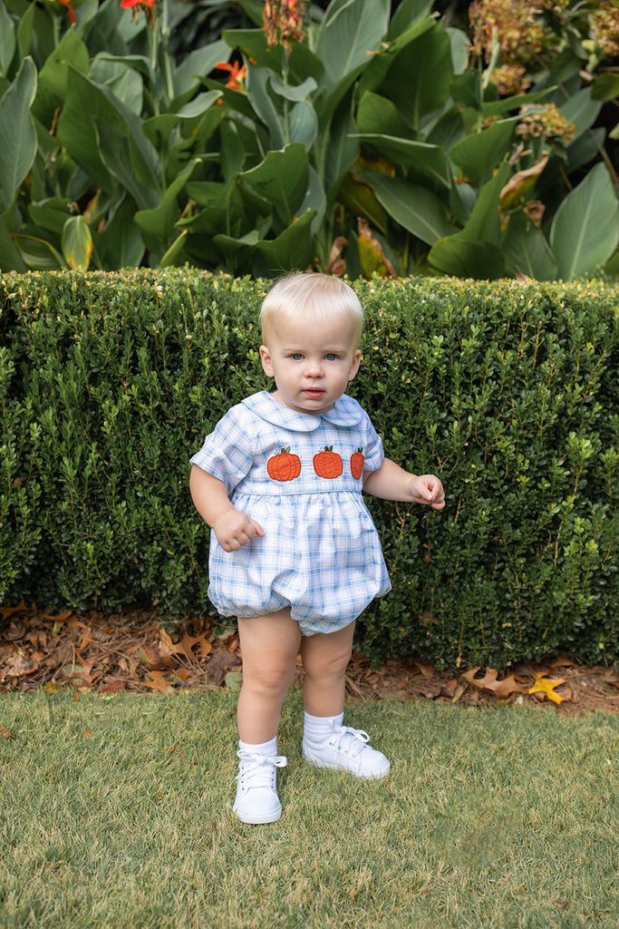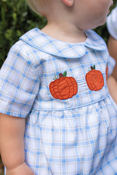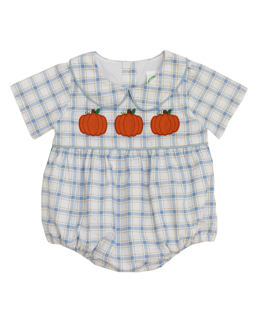 The Towns Pumpkin Bubble blends classic plaid with a charming Peter Pan collar for a timeless look. Adorned with adorable applique pumpkins, this playful outfit is perfect for celebrating the cozy spirit of fall. Soft and comfortable, it’s ideal for everything from family photos to festive fall outings.